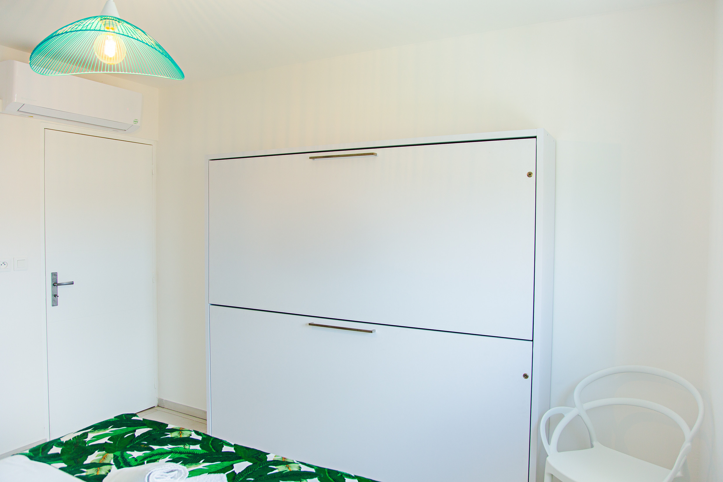 La seconde chambre dispose d’un lit double de 160 cm, d’une grande penderie et de deux couchages supplémentaires sous forme de lits escamotables avec une literie de qualité (20€/jour/personne supplémentaire)